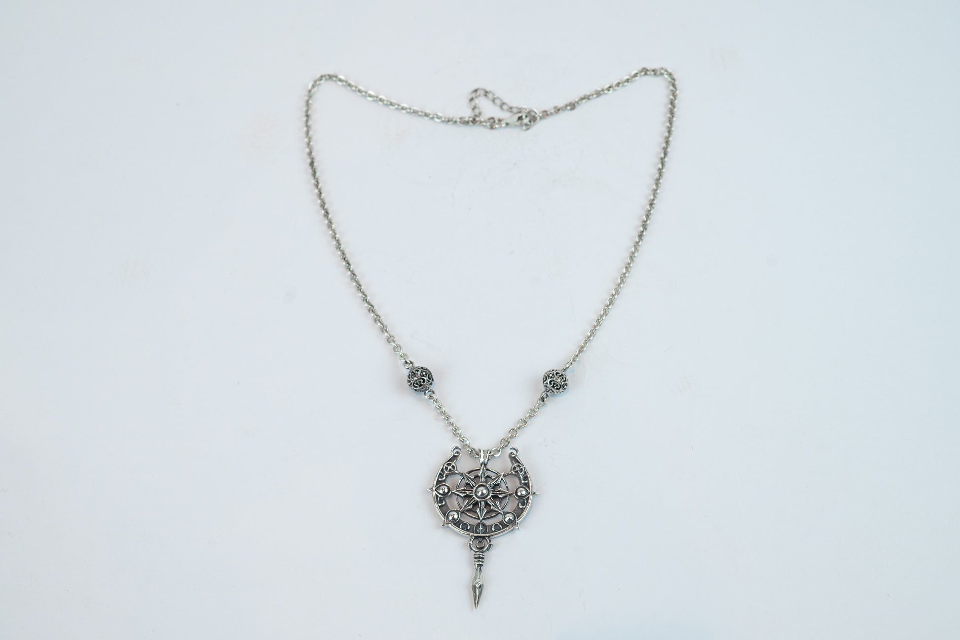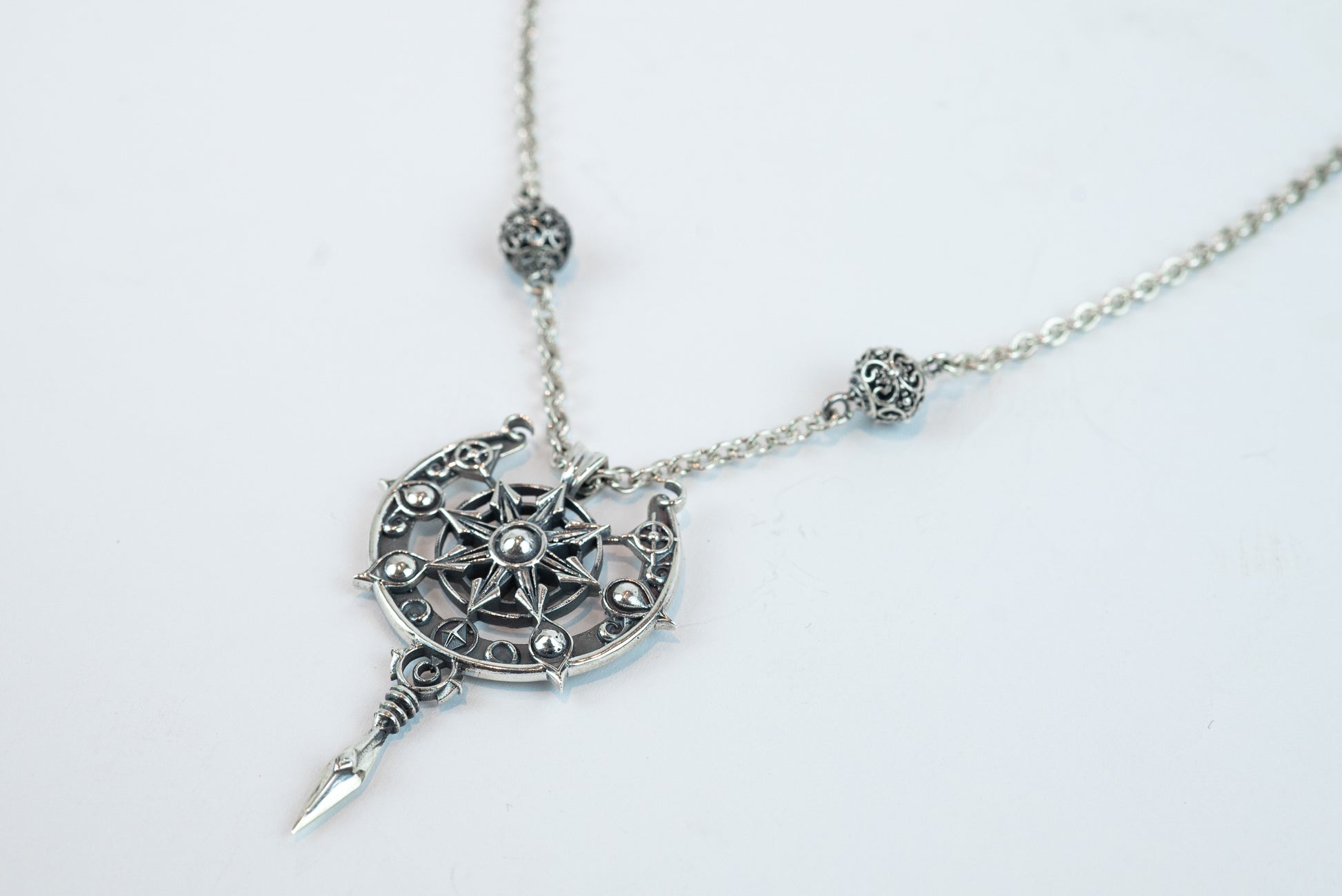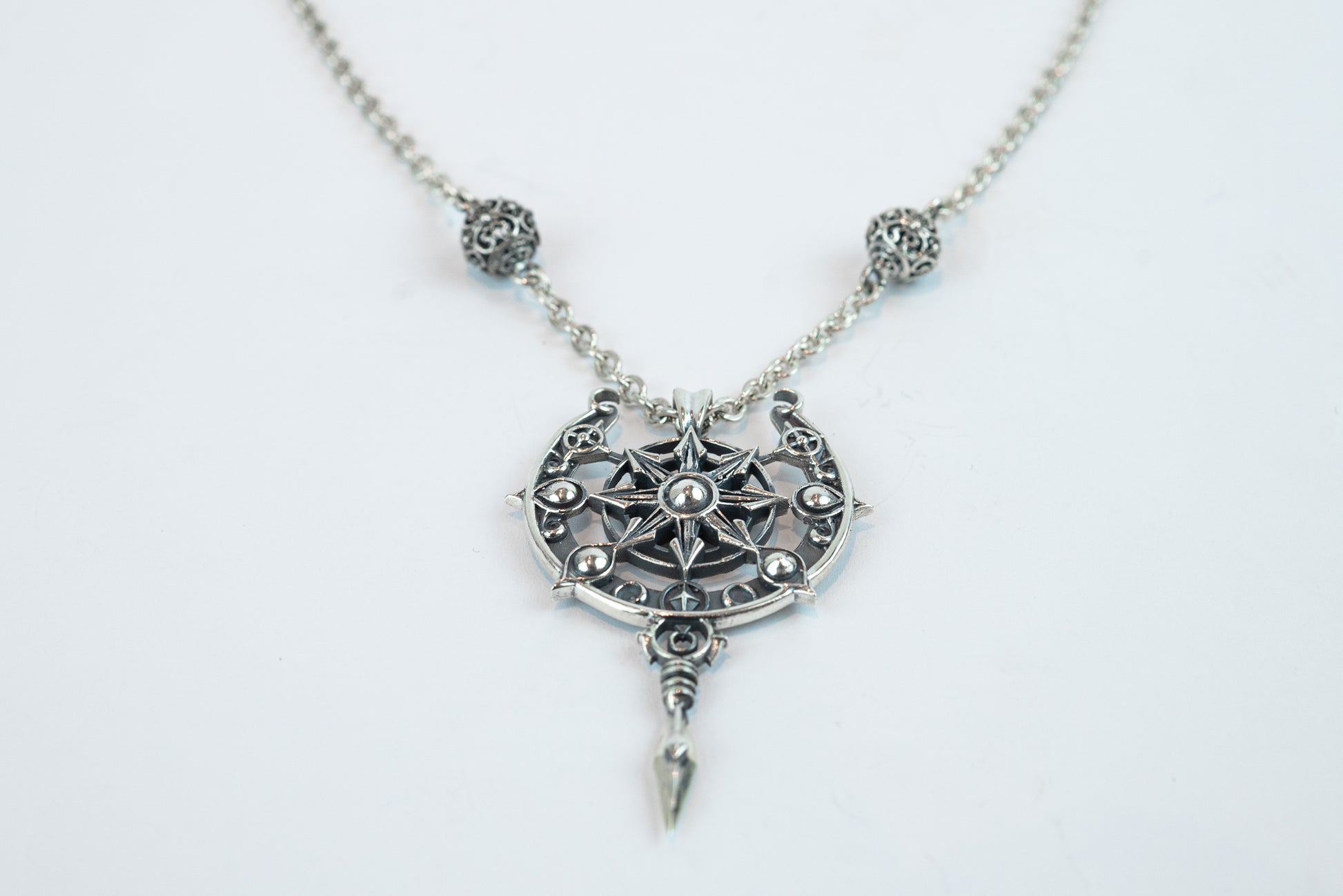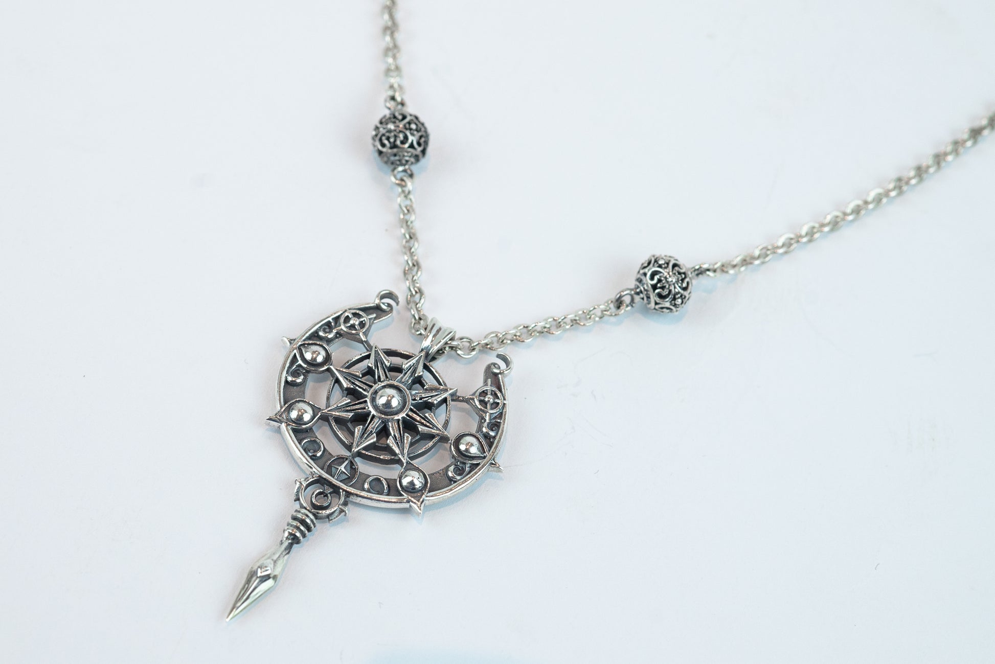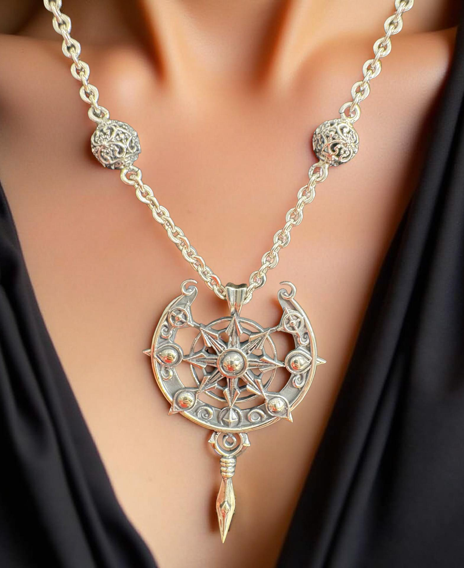 The pendant is forged in sterling silver or 21-carat gold, featuring a bold compass-like star encircled by a crescent—an emblem of guidance, fate, and protection across uncharted seas. At its base, a spear-shaped drop pays homage to Viking weaponry, symbolizing determination and conquest.